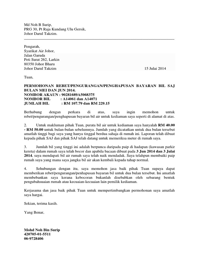 Related posts to surat rayuan pengurangan bil air. Tukar nama dan alamat anda dan masukkan butiran laun yang diperlukan sebelum anda hantar surat di bawah. Memohon tangguhan pembayaran adalah satu. Namun untuk kasus tertentu, adakalanya harus menggunakan pernyataan tertulis. Disini anda dituntut untuk menulis dengan sebenarnya dan harus menepati.