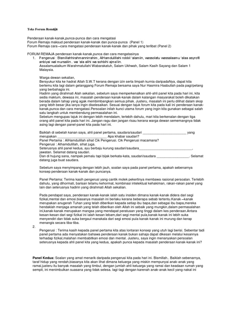 Teks Forum Remaja 2018 Edit Doc Pengerusi Assalamualaikum Warahmatullahi Wabaraktuh Salam Ukhwah Salam Kasih Sayang Dan Salam 1malaysia Yang Course Hero from www.coursehero.com Keruntuhan nilai moral dalam kalangan remaja hari ini. So please help us by uploading 1 new document or like us to download Tanggungjawab siapa forum remaja pencetus kecemerlangan diri (pengerusi) forum remaja jendela kematangan minda (panel 1) forum remaja pintu kesuburan rohani (panel 2) forum remaja membentuk insan insani (panel 3). Tanggungjawab siapa forum remaja pencetus kecemerlangan diri (pengerusi) ( pengerusi) forum remaja jendela kematangan minda (panel 1) forum remaja pintu kesuburan rohani (panel 2) forum remaja membentuk insan. Contoh teks tanggapan kritis tentang pendidikan di sekolah. Percubaan keempat ,forum remaja penjana kelahiran generasi berinformasi. Contoh teks diskusi tentang narkoba. Bingung juga karena belum persiapan teks seperti apa untuk acara kedepan?