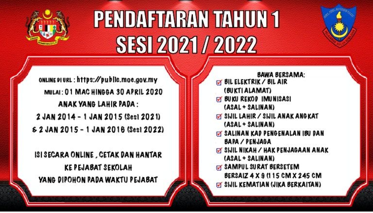 Related : Public.moe.gov.my Tahun 1 2021 - Panduan cara membuat permohonan pendaftaran murid darjah 1 tahun 2021 / 2022:.