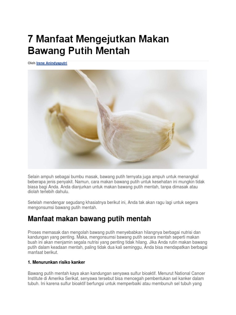 Makan bawang putih di pagi hari sebelum sarapan, hasilnya mengejutkan alasan mengapa lebih efektif bila dimakan sebelum sarapan adalah bahwa pada saat itu, bakteri sedang muncul, sehingga mereka. Coba makan 1 siung bawang putih mentah setiap pagi saat perut kosong, dan rasakan manfaatnya yang luar biasa ini, penderita diabetes sangat dianjurkan. Meskipun demikian, penelitian lebih lanjut masih dibutuhkan untuk memastikan kegunaan bawang putih didalam menghindar kanker paru. Beli bawang putih tunggal di zams herbal. Jika anda tidak ingin bertemu dengan allicin saat melewati mulut, cukup saja anda telan bawang putih mentah tersebut.